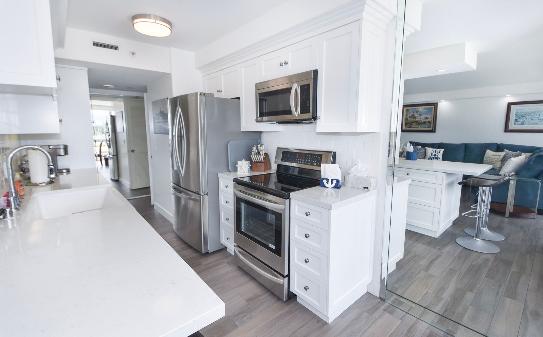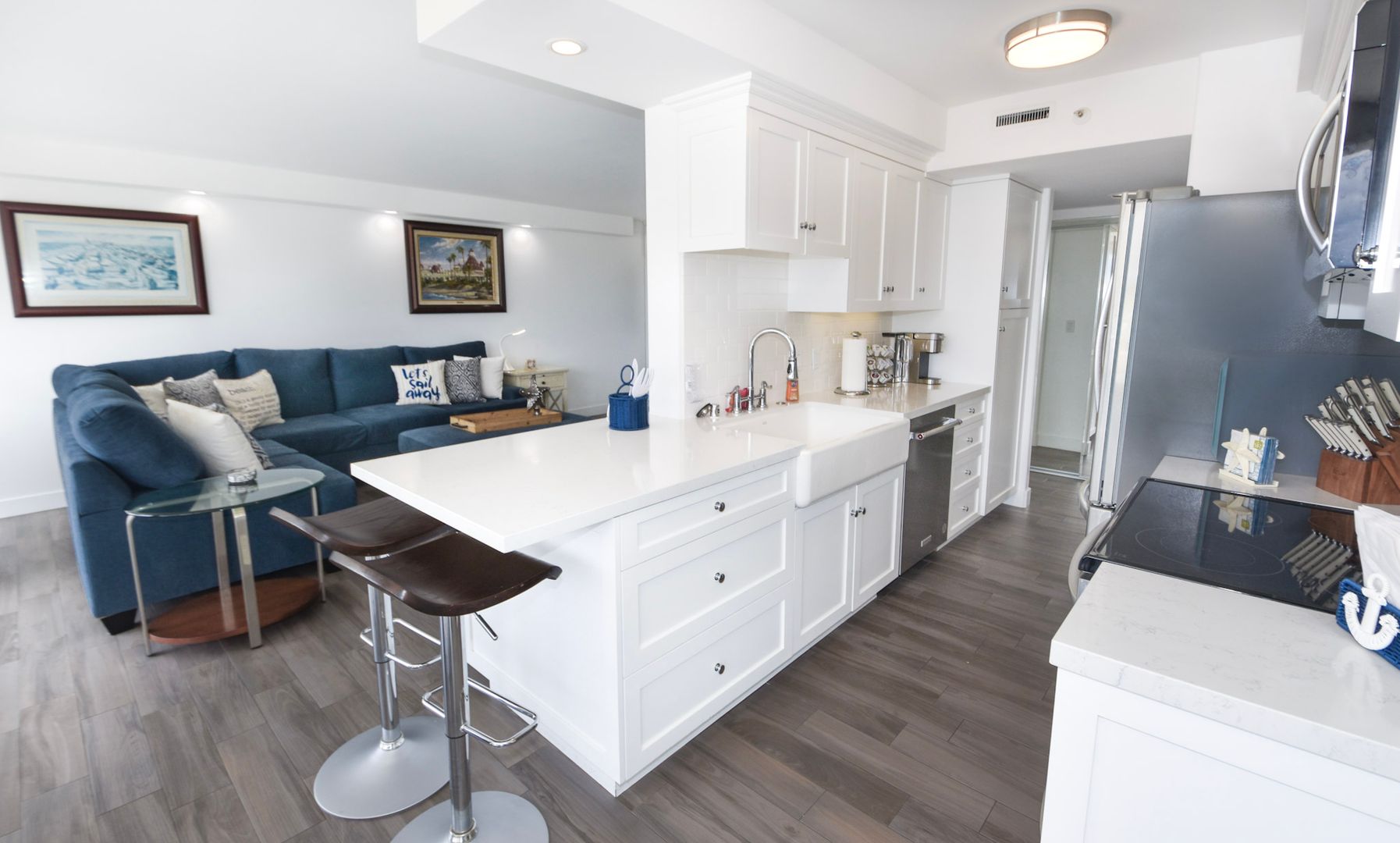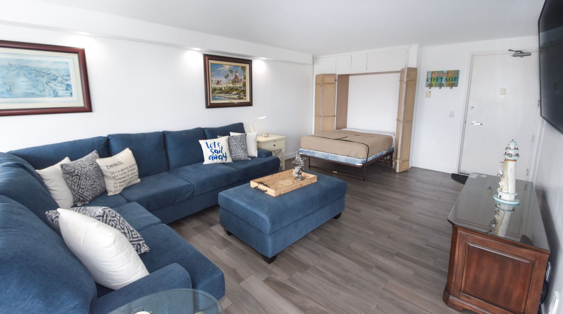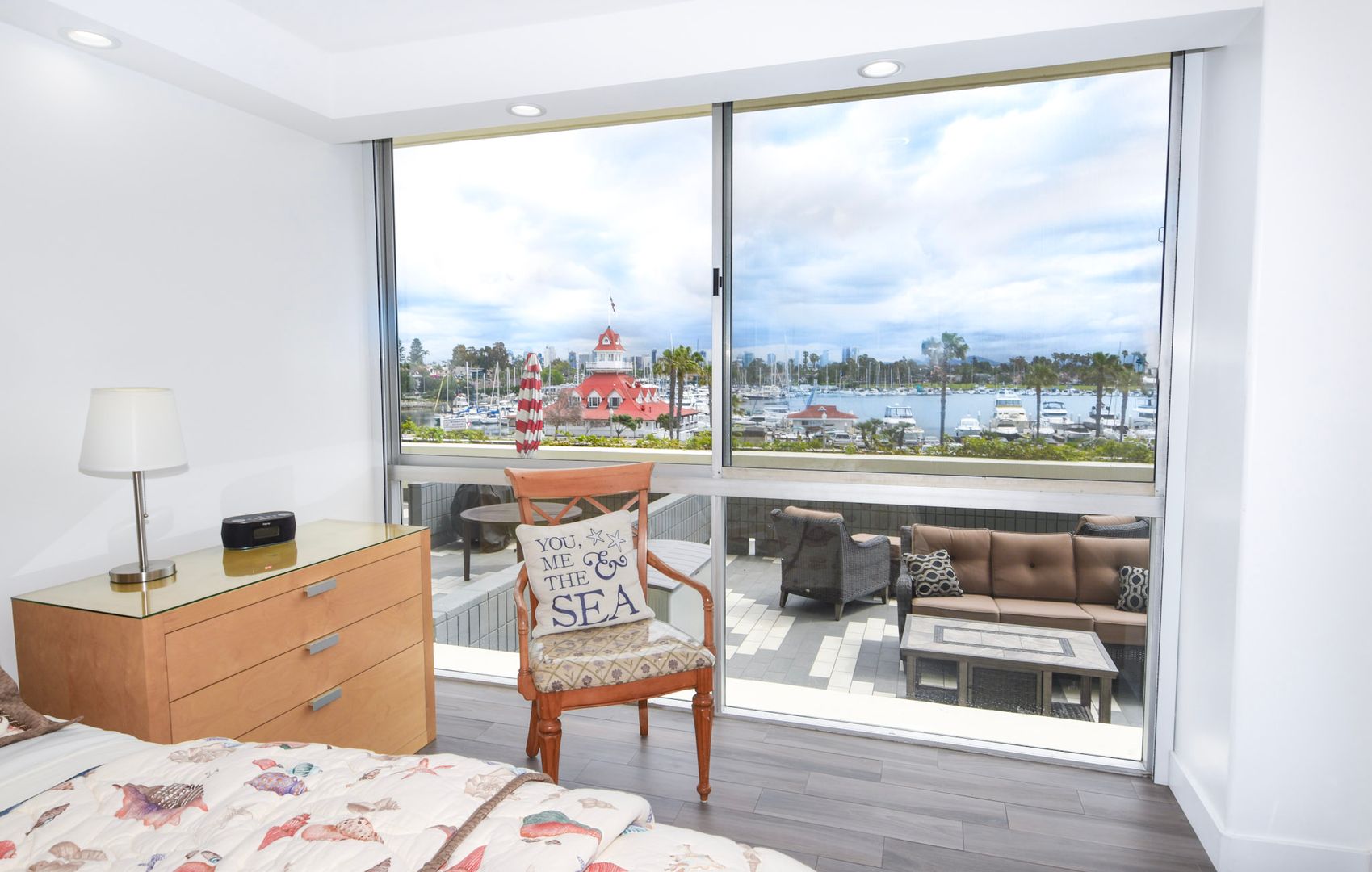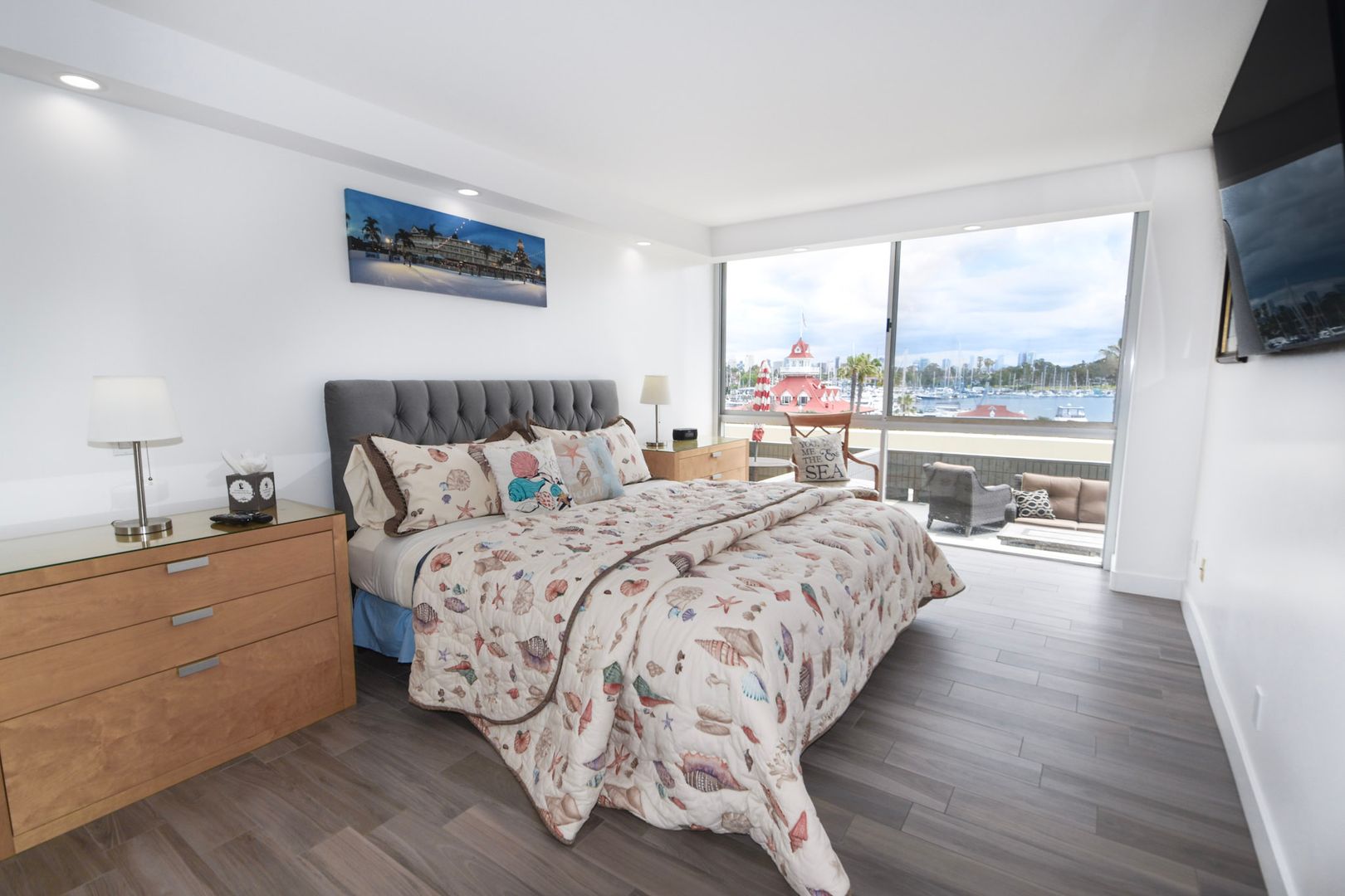 Beautifully updated one bedroom unit in the Coronado Shores. Offers unobstructed views of Coronado bridge, Glorietta Bay and the beautiful San Diego skyline. Granite counter tops, stainless steel kitchen appliances and hardwood floors throughout. Murphey bed in the living room for additional guests. Updated bathroom and walk-in shower. The terrace features an extended outside area with patio furniture. Community offers access to the white sandy beach, swimming pool, tennis courts, clubhouse and a 24-hour doorman/ security available. Walk to the famous Hotel Del Coronado, shopping and dining in the Coronado Village