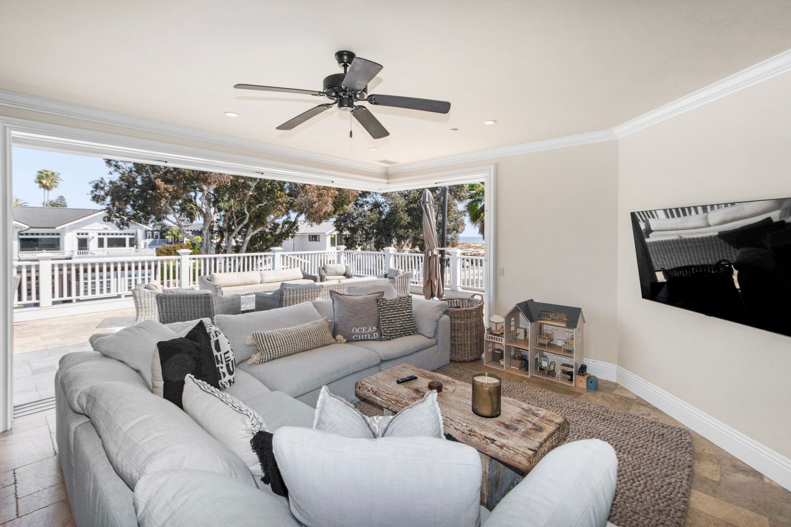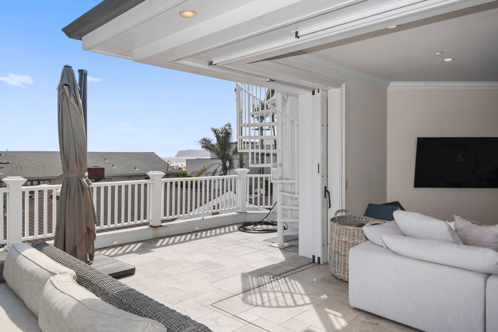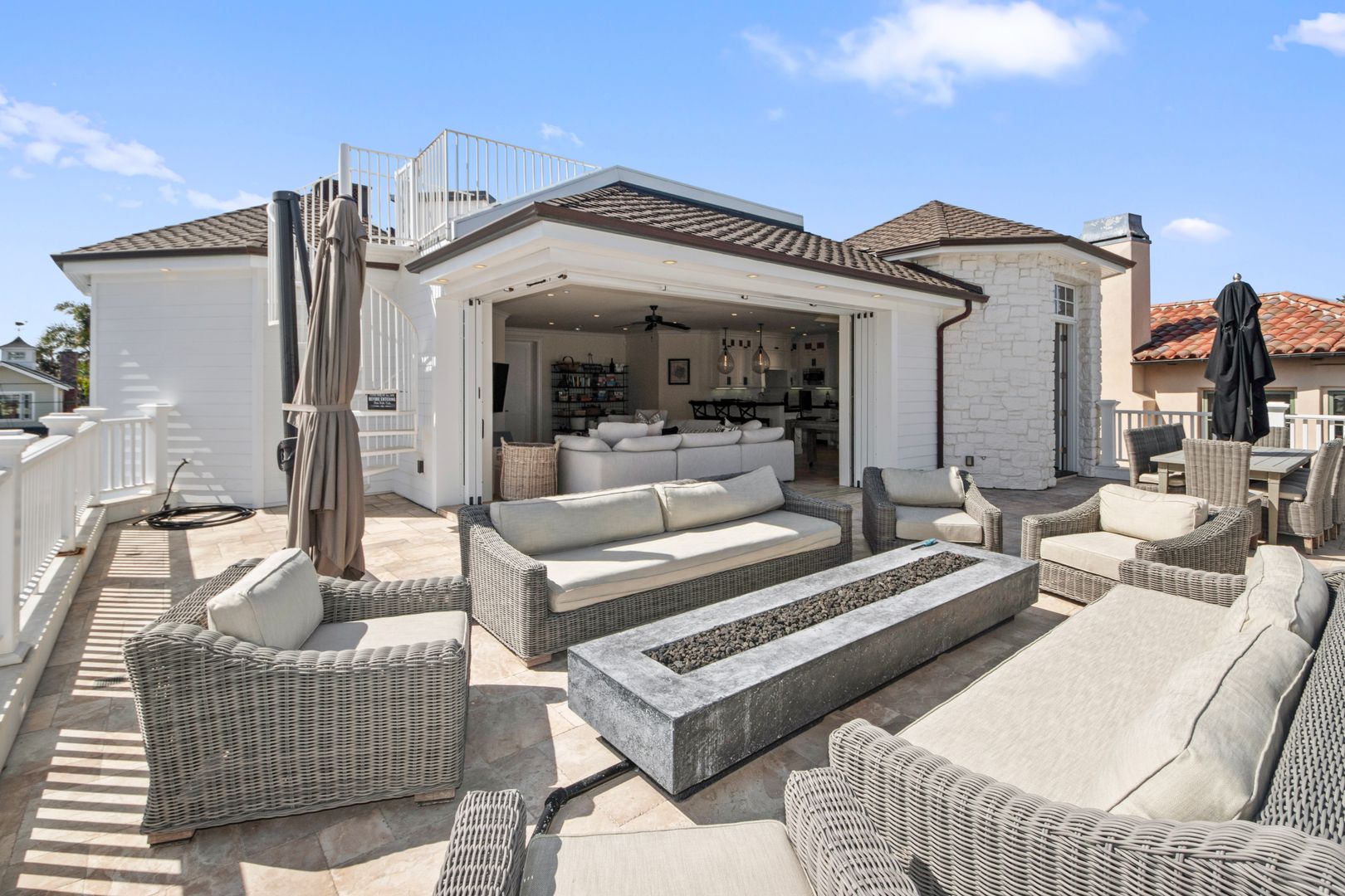 Upstairs, a second open-concept living space includes an additional kitchen, dining, and lounge area with retractable doors that lead to a massive balcony—ideal for soaking in the ocean breeze and views. The primary suite serves as a luxurious retreat with a spa-inspired bathroom and stunning coastal outlooks.